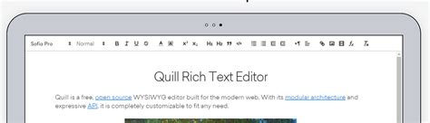 One of the standout features of Quill.js is its sleek and modern design. The editor provides a clean and intuitive interface that makes writing a pleasure. The toolbar, which houses various formatting options, is elegantly designed and customizable. You can easily add or remove buttons, rearrange them, or even create your own custom buttons tailored to your application's needs. This level of flexibility allows you to create a truly personalized writing experience for your users.